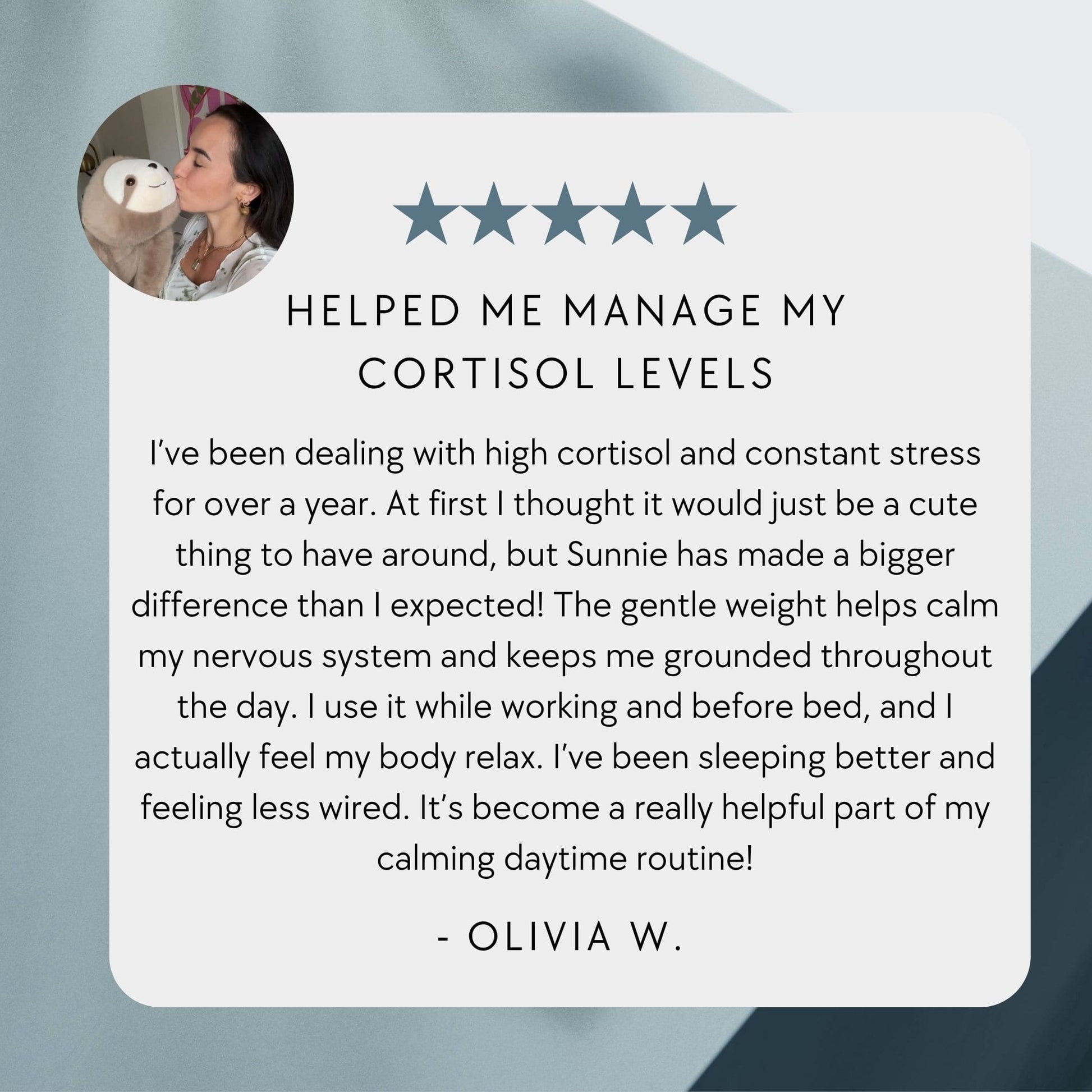 Meet Sunnie the Sloth, a weighted stuffed animal with extra-long arms and paws that hug you back. Sunnie helps you stay focused, feel safe, and reduce cortisol and anxiety. Whether you're working, studying, or winding down, Sunnie brings the comfort of a warm hug anytime you need it.